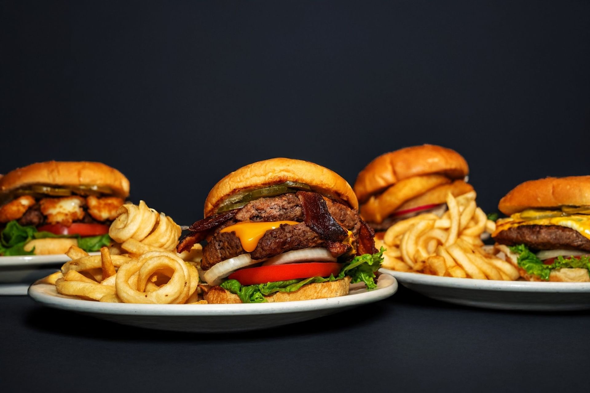 Two beef patties, brioche bun, cheddar cheese, bacon, lettuce, tomato, onions